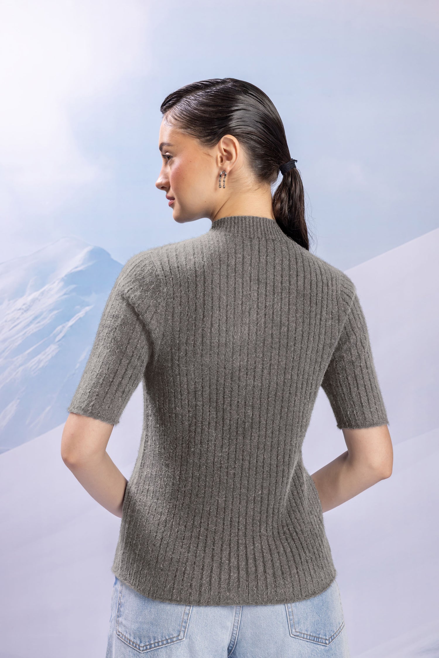 Strong like stone, soft like night. This high-neck piece embodies depth and strength through minimal lines and rich texture.